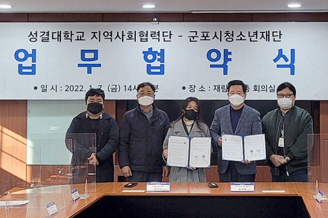 지난 1월 12일(수), 군포시청소년재단(대표이사 김지수)이 7일 성결대학교(총장 김상식) 지역사회협력단과 업무 협약을 체결했다고 밝혔다. 이번 업무 협약은 지역 청소년의 건강한 성장과 청소년의 다양한 활동 기회를 확대하고자 진행되었으며 주요 내용은 △지역사회 청소년 동아리 지원 및 학습공동체 프로그램 개발 및 운영△대학 학부(과) 및 4차 산업 진로 체험 운영 지원 △맞춤형 기술 인력 양성을 위한 공동 협력 및 교육 참여(교수, 특강)와 그 외에 필요한 정보와 자원의 상호 활용 및 교류 등이다.