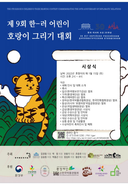 지난 1월 13일(목), 한국범보전기금이 다가오는 15일(토) 오후 2시에 ‘제9회 한-러 어린이 호랑이 그리기 대회’ 시상식을 줌을 통해 개최한다고 밝혔다. 본 대회 시상식은 코로나19 확산 방지 및 어린이들의 안전을 위해 약식으로 진행될 예정이다. 또한 ‘한국호랑이와 한국표범의 하루’를 주제로 총 2300여 점의 응모작이 접수됐으며, 그중 105점이 수상작으로 선정됐다. 9회 대회 시상에는 대상 수상자 1인에게 ‘국회의장상’이 수여된다.