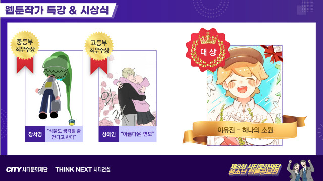 시티문화재단은 지난 10월 2일(토) 유튜브 실시간 스트리밍을 통해 ‘제3회 시티문화재단 청소년 웹툰 공모전 온라인 시상식’을 개최했다고 밝혔다. 올해 3회를 맞은 시티문화재단 청소년 웹툰 공모전은 청소년들의 무한한 창의력과 상상력을 응원하고 차세대 창작자로서의 성장을 돕기 위해 개최되어 많은 청소년의 참여 호응을 얻고 있다.