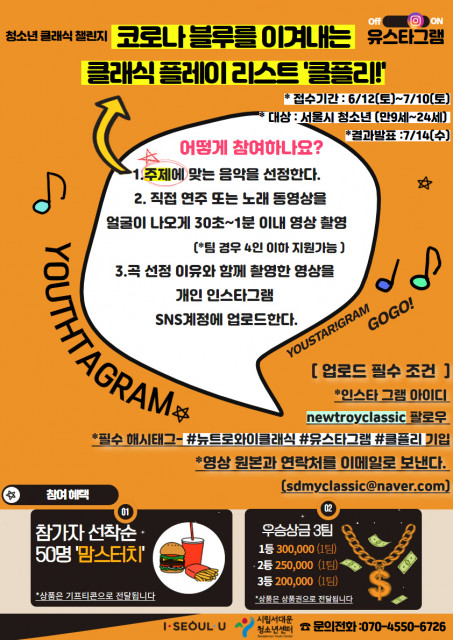 서울시립서대문청소년센터(이하 서대문센터)는 7월 10일(토)까지 청소년 클래식 영상챌린지 '클플리' 참가자를 모집한다고 밝혔다. 이번 챌린지는 클래식 플레이 리스트의 줄임 말로, 코로나 블루를 해소하기 위한 예술 활동 기회를 제공하고 코로나19 사태가 장기화됨에 따라 모든 청소년이 함께 극복하고 동참하자는 취지에서 마련한 참여형 챌린지다.