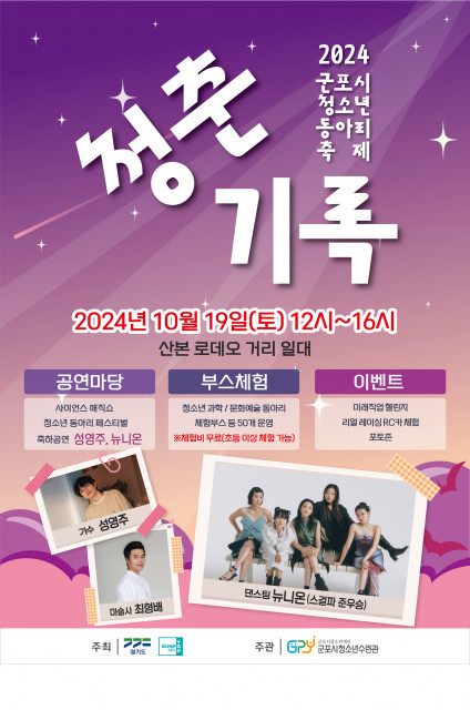 군포시청소년재단 군포시청소년수련관(관장 박윤정)은 오는 19일(토) 군포시 산본 로데오거리 일대에서 '2024 군포시 청소년 동아리 축제 - 청춘기록'을 개최한다고 전했다. 이번 축제는 청소년들이 자신만의 끼와 여러 재능을 발휘할 수 있는 다양한 볼거리 및 즐길 거리를 제공하고자 경기도와 군포시와 주최하고, 군포시청소년수련관이 주관하는 행사다.