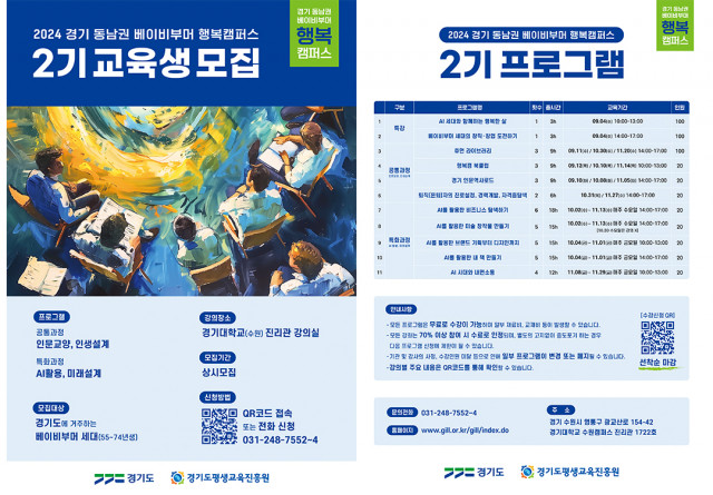 경기도평생교육진흥원이 베이비부머 세대(1955~74년생)의 성공적인 인생 2막을 위한 재도약 및 사회참여 기회 확대를 지원하고자 '경기 동남권 베이비부머 행복캠퍼스' 2기 교육생을 모집한다고 밝혔다. 이번 2기 교육생 모집은 1기와 동일하게 선착순으로 진행되며, 진흥원 공식 홈페이지 또는 QR코드 등을 통해 신청할 수 있다. 행복캠퍼스 동남권의 모든 교육 프로그램은 경기대학교 수원 캠퍼스에서 진행될 예정이다.