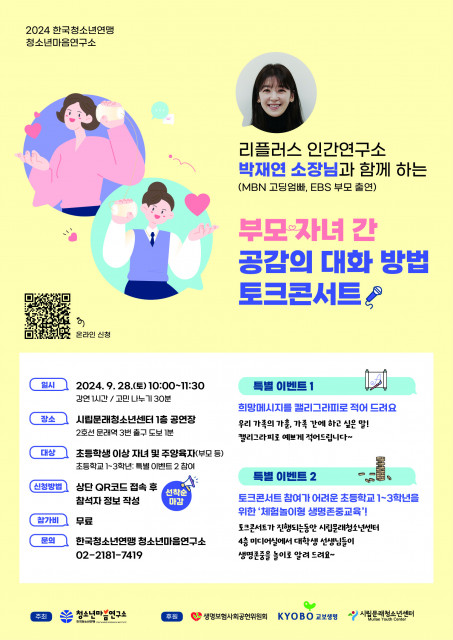 한국청소년연맹 청소년마음연구소(소장 허정)는 오는 9월 28일(토) 시립문래청소년센터에서 양육자와 자녀가 함께 참여 가능한 토크콘서트를 개최한다고 전했다. 이번 토크콘서트는 화목하고 건강한 가정을 만드는 데 기여하기 위해 기획됐으며, 강연자로는 리플러스 인간연구소의 박재연 소장이 나선다.