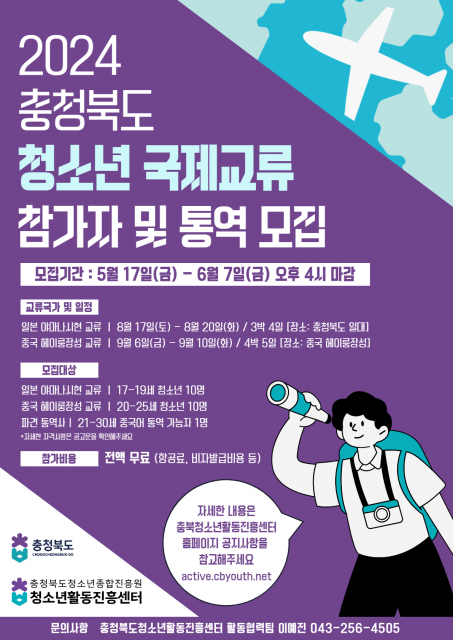 충청북도(도지사 김영환)와 충청북도청소년종합진흥원(원장 홍상표) 청소년활동진흥센터는 청소년 글로벌 역량을 강화하기 위해 실시하는 '2024 충청북도 청소년 국제교류' 참가자를 모집한다고 밝혔다.