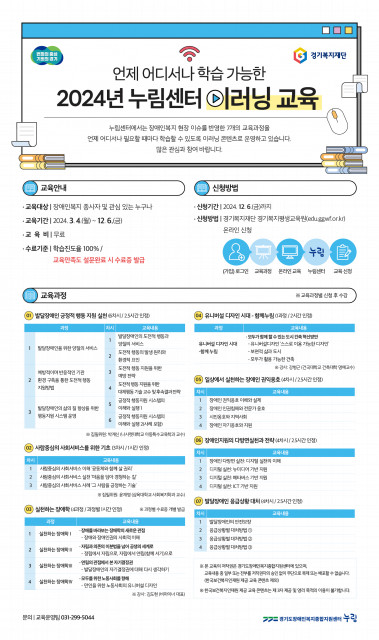 경기도장애인복지종합지원센터(이하 누림센터)는 다양한 장애인복지 현장의 욕구를 반영함으로써 장애인복지 종사자 및 관심 있는 누구나를 대상으로 '2024년 누림센터 이러닝 교육'을 운영한다고 밝혔다.