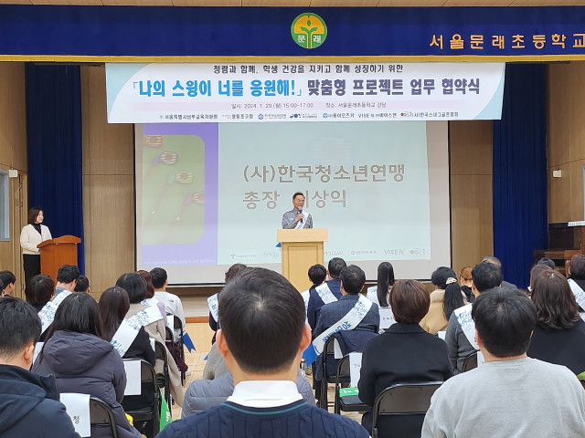 지난 1월 30일(화), 한국청소년연맹(총재 임호영)은 2024 공동체형 학교 만들기 '나의 스윙이 너를 응원해!' 맞춤형 프로젝트를 추진하고자 다자간 업무협약을 체결했다고 전했다. 29일(월) 오후 3시 서울문래초등학교 강당에서 개최된 이번 업무협약은 2024 ‘공동체형 학교’로 나아가기 위한 민·관·학 합동 프로젝트로, ‘스내그골프’를 매개로 하여 학생들의 성장 지원과 함께 생명존중 의식으로 높이고자 진행됐다.