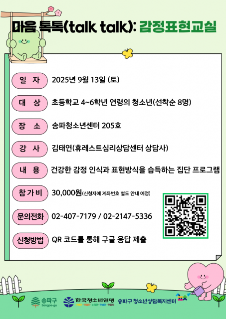 서울 송파구(구청장 서강석)는 청소년들이 자신의 감정에 대해 이해하고 상황에 맞는 적절하고 건강한 표현 방법을 배우기 위한 ‘마음톡톡: 감정표현교실’을 오는 13일 진행한다고 전했다. 이번 프로그램은 송파구청소년상담복지센터에서 주관하며 초등학교 4~6학년을 대상으로 실시한다.