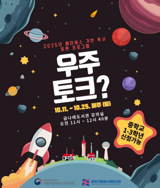 금천문화재단(대표이사 서영철) 금천구립금나래도서관은 오는 10월 11일(토)부터 중학생을 대상으로 메타버스 기반의 독서토론 프로그램 ‘우주토크?’를 운영한다고 전했다. 본 프로그램은 국립어린이청소년도서관과 디베이트포올에서 주관하는 공모사업 ‘우주토크?’에 금천구립금나래도서관이 선정되어 마련했으며 금나래도서관은 청소년들의 디지털 리터러시 향상과 사고력 및 논리적 표현력 향상을 위한 기회를 제공할 예정이다.
