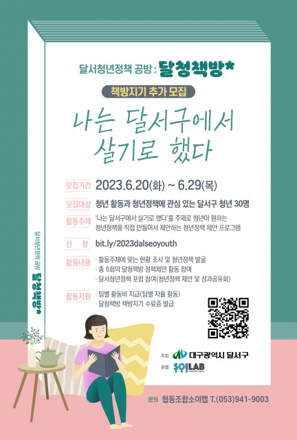 대구 달서구청과 협동조합소이랩은 다가오는 7월부터 청년정책 제안 프로그램 ‘달서청년정책공방 : 달청책방’ 운영과 함께 6월 29일(목)까지 참가자인 ‘달청책방 책방지기’를 모집한다고 밝혔다. ‘달서청년정책공방 : 달청책방’은 달서구청이 주최하고 협동조합소이랩이 운영하며 청년참여형 주민참여예산 선정 사업으로 진행되는 청년정책 제안 프로그램이다.