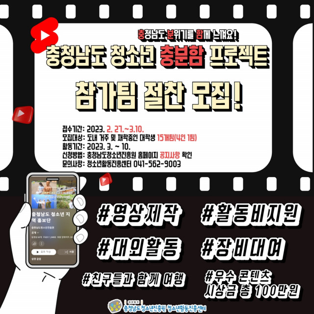 재단법인 충청남도청소년진흥원(원장 직무대리 이순실)은 3월 10일까지 지역 탐방을 통해 지역사회의 홍보 콘텐츠를 제작하는 ‘청소년 충.분.함 프로젝트’ 참가 청소년을 모집한다고 밝혔다. 2023 충청남도 도민참여예산 공모 사업을 통해 추진되는 이번 청소년 충.분.함 프로젝트는 청소년의 주도적인 참여를 기반으로 충청남도 지역사회를 홍보하고, 여가 문화를 형성하고자 기획됐다.