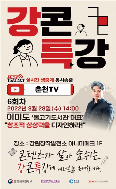 강원콘텐츠코리아랩이 정기적으로 진행하고 있는 '2022 강콘 특강' 여섯 번째 강연자로 물고기 도서관의 이미도 대표를 초청했다. 해당 행사는 강원도 내 콘텐츠 창작 및 문화 활성화를 위해 문화 콘텐츠 분야 전문가를 초청하는 특별 강연으로 총 8회 차로 진행된다. 오는 9월 28일(수) 오후 2시 강원콘텐츠코리아랩 1층 아니마떼끄 공연장에서 그 여섯 번째 이야기를 들을 수 있다.