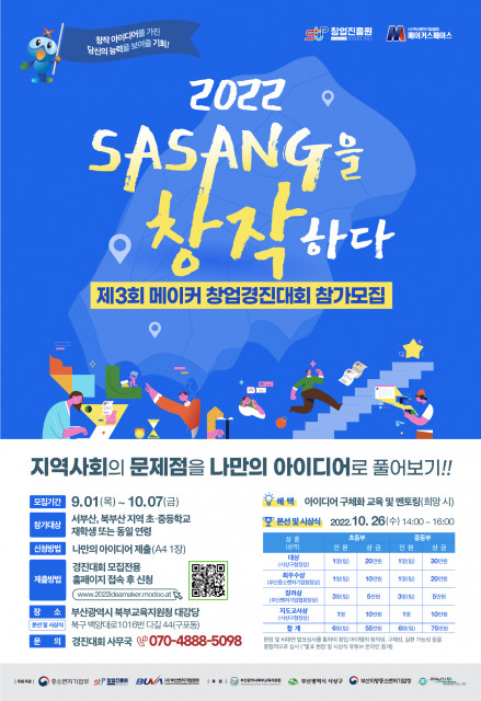 부산벤처기업협회(회장 김병국)는 사상구청(청장 조병길), 북부교육청지원청 등 협력 기관과 함께 학생이 바라보는 시선에서 지역 사회의 여러 문제점을 해결하는 아이디어를 발굴하기 위해 제3회 메이커 경진대회 '사상을 창작하다'를 개최한다.