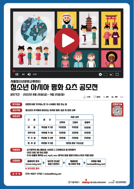 서울시립청소년문화교류센터(미지센터)가 9월 25일까지 '청소년 아시아 평화 쇼츠 공모전'을 개최한다. 이번 공모전은 전국의 만 14~24세 청소년을 대상으로 진행되며 중·고·대학부 연령별 심사를 통해 총 27편의 우수작을 선발할 예정이다.