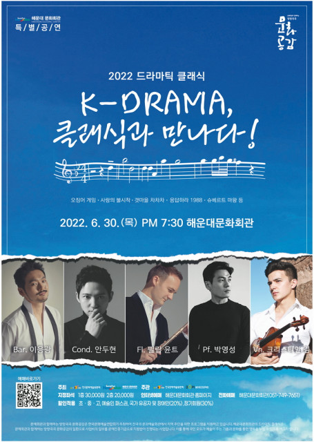 해운대문화회관(관장 서영지)이 다가오는 6월 30일(목) 저녁 7시 30분 해운대문화회관 해운홀에서 보다 쉽게 클래식을 접할 수 있는 드라마틱 클래식 ‘K-DRAMA, 클래식과 만나다’를 개최한다. 해운대에서 우수 출연진들의 무대를 만나볼 수 있는 이번 공연은 한국문화예술회관이 주최하는 방방곡곡 문화공감의 하나로 진행한다.