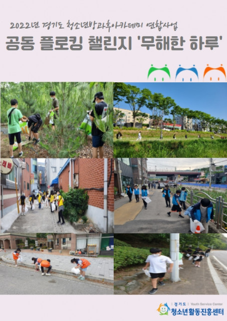 6월 8일(수), 경기도청소년활동진흥센터(센터장 권구연, 이하 경청센터)는 지난 5월 30일부터 6월 3일까지 경기도 청소년방과후아카데미 22곳과 연합으로 공동 플로킹 챌린지 '무해한 하루'를 진행했다 밝혔다. 이번 챌린지는 환경의 날을 맞이해 지역사회 정화 활동에 동참하고 환경을 소중히 생각하자는 의미로 진행되었으며, 이를 위해 도 내 청소년방과후아카데미 22곳에 소속된 611명의 청소년이 지역사회 일대를 함께 걸으며 쓰레기를 줍는 환경 정화 활동을 진행했다.