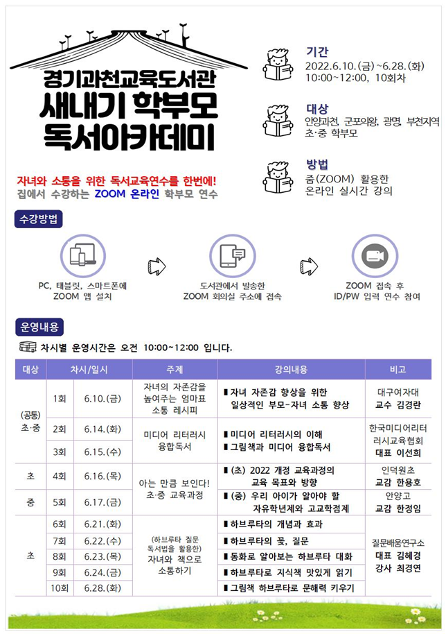 경기과천교육도서관(관장 하석종)이 6월 10일(금)부터 28일(화)까지 초·중 새내기 학부모를 대상으로 ‘새내기 학부모 독서아카데미’를 온라인으로 운영한다. 이는 자녀와 함께 하는 독서 활동 방법을 기반으로 학부모가 자녀를 이해하고 소통하는 방법을 제시하며 변화하는 교육과정을 이해하는 데 도움을 주고자 교육도서관에서 마련했다.
