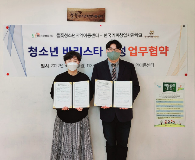 지난 4월 11일(월), 한국커피창업사관학교는 강동구에 위치한 청소년지역아동센터에서 들꽃청소년지역아동센터(이하 청소년지역아동센터)와 함께 커피 교육 및 진로 체험 활성화를 위한 업무협약을 체결했다고 밝혔다. 이날 협약식은 청소년지역아동센터의 건강하고 올바른 청소년을 육성하기 위한 커피 교육 분야 공동 협력이 필요하다는 분위기에 따라 추진되었으며 한국커피창업사관학교 최용국 대표, 들꽃청소년지역아동센터 김지혜 센터장과 각 기관 실무 담당자가 참석한 가운데 진행되었다.