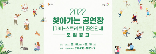 지난 2월 3일(목), 화성시문화재단이 2022년도 ‘찾아가는 공연장’에 함께 참여할 공연단체를 모집한다고 밝혔다. 이번 단체 모집 공고는 2월 7일(월)부터 18일(금)까지 서류 접수를 실시할 예정이다. ‘찾아가는 공연장’은 거리 공연과 시민들의 신청 공연으로 거리, 공원 등 화성시 곳곳을 직접 찾아가 시민들의 일상 공간에서 공연을 선보이고 있으며 작년에는 39개 단체가 선정된 바 있다. 이들은 125회의 공연과 함께 영상 콘텐츠를 선보였으며, 1만 5000여 명의 시민과 함께했다.