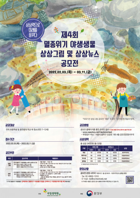 환경부 산하 국립생태원(원장 조도순)은 ‘제4회 멸종위기 야생생물 상상그림 및 상상뉴스 공모전(이하 공모전)’을 개최하고, 2월 3일부터 3월 11일까지 작품을 접수한다. 올해로 네 번째를 맞는 상상그림 공모전은 2019년에 510명이 참가한 이래 2020년에는 1914명, 2021년에는 2516명으로 매년 참가자 수가 늘어나 어린이에게 인기 있는 행사로 자리매김하고 있다.