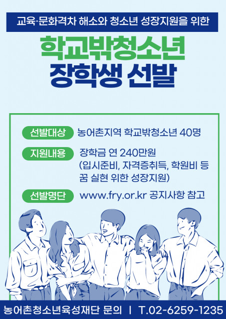 농어촌청소년육성재단(이사장 박성자)이 40명의 학교밖청소년에게 1인당 240만원의 장학금을 지급한다. 장학금은 학비 지원에 국한하지 않고 청소년들의 자격증 취득 및 학습기기 구입, 생활 안정 등 꿈을 실현하기 위한 사용처에 활용이 가능하다.