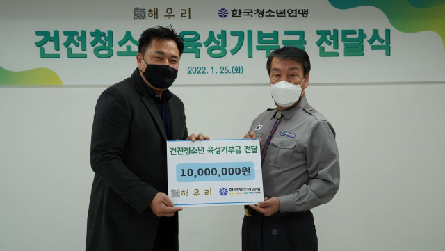 지난 1월 25일(화), 한국청소년연맹(총재 임호영)은 해우리(오유택 대표)가 건전청소년 육성을 위한 기부금을 기탁했다고 밝혔다. 해우리는 남도 요리를 기반으로 건강한 웰빙 식사 문화를 위해 앞장서고 있는 기업으로, 2007년 강남 본점 해우리를 시작으로 고객의 사랑과 각고의 노력 끝에 해초 요리 전문 1등 브랜드로 발전하였으며, 현재는 전국에 12개 매장이 운영되고 있다.