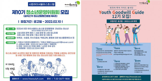 서울시립하이서울유스호스텔(본부장 이정연)이 다가오는 2월 10일(목)까지 2022년 청소년운영위원회 제10기 운영위원 및 특성화 동아리인 외국인 투어 가이드 봉사단 ‘유스굿윌가이드’ 제12기 회원을 모집한다. 청소년활동진흥법 제4조에 근거해 만들어진 청소년운영위원회는 청소년들이 청소년수련시설 운영과 각종 프로그램 등의 자문 및 평가에 직접 참여해 봄으로써 청소년의 참여 의식을 확대시키고자 한다.