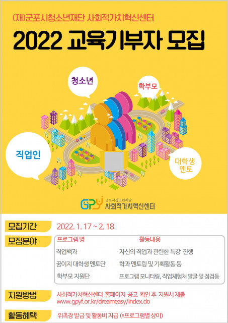 지난 1월 19일(수), 군포시청소년재단 사회적가치혁신센터가 지역 인적 자원 구축과 함께 경험 공유를 통한 마을 교육 실현을 위해 사업에 참여할 교육 기부자를 모집한다고 밝혔다. 이번 2022년 교육기부자는 현직 전문 직업인, 대학(원)생, 학부모를 중점적으로 모집하는데 우선 ‘직업백과’는 자신의 직무와 직업, 경험을 바탕으로 청소년 대상 강의 및 멘토링을 진행할 교육 기부자를 모집한다.