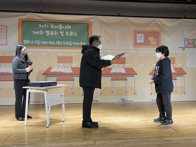 지난 12월 24일(금), 서울특별시가 건립하고 사단법인 한국청소년세상에서 수탁 운영하고 있는 시립수서청소년센터(관장 정영화) 방과후아카데미 꿈나래가 제4회 수료식 ‘2021 꿈나래 어워즈’를 개최했다. 이번 수료식은 코로나19 확산 방지를 위해 규모를 축소하여 참여 청소년만을 대상으로 진행됐다. 2021년 연간 참여과정에 대한 수료증 수여를 시작으로, 꿈나래 청소년들이 친구를 생각하며 직접 제작한 특별 상장을 전달했다.