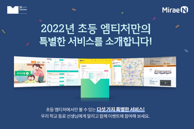 지난 1월 4일(화), 교육 출판 전문기업 미래엔이 신년을 맞이하여 1월 4일부터 28일까지 약 4주간 교수활동지원 플랫폼 초등 엠티처에서 엠티처만의 특별한 서비스들을 소개하고 가장 기대되는 서비스에 대한 설문 이벤트를 실시한다고 밝혔다. 이번 이벤트를 통해 소개되는 미래엔 엠티처만의 특별한 서비스는 △선생님의 시간표(날짜, 차시)에 맞춰 다양한 수업 자료를 추천하는 똑똑한 수업 큐레이션 ‘스케줄 큐브’ △다변화되는 수업 환경 속에서 선생님들의 다양한 관심사와 새로운 교수법을 다루는 온라인 연수 ‘엠티처 디지털 강연회’ 등이다.