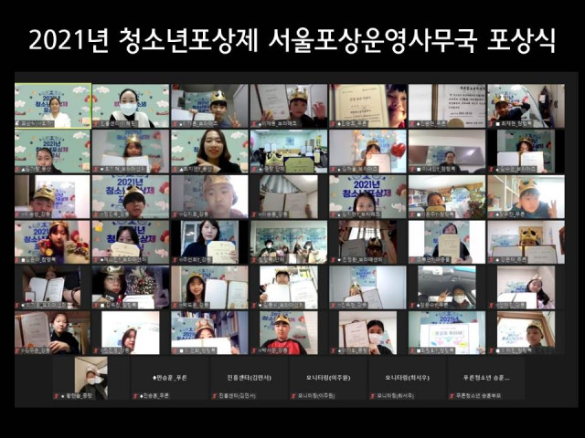 12월 16일(목), 서울특별시립청소년활동진흥센터(소장 박지성, 이하 서울시립청소년활동진흥센터)가 지난 11일 '2021년 청소년포상제 서울포상운영사무국 포상식'을 개최했다고 밝혔다. 온라인 플랫폼 ZOOM을 통해 개최된 이번 포상식에서는 장기화되고 있는 코로나19 상황 속에서도 자신이 세운 목표를 성취한 청소년 총 40명(청소년자기도전포상제 36명, 국제청소년포상제 4명)에게 인증서를 수여 하고 활동을 격려했다.