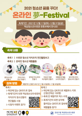 강남구립 역삼청소년수련관(관장 정성기)은 다가오는 12월 11일(토) 부터 31일(금)까지 약 3주 간 청소년 축제 ‘청소년 꿈을 꾸다! 夢-Festival’을 운영한다. 올해로 11회를 맞은 이번 축제는 청소년들의 성장과 지역 주민들의 놀이문화 제공을 위해 청소년들이 직접 기획·준비했으며 매년 연말 진행되고 있다.