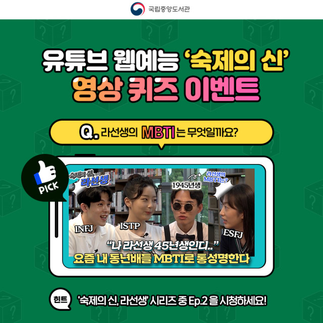 국립중앙도서관, 유튜브 웹예능 ‘숙제의 신, 라선생’ 영상 퀴즈 이벤트 진행