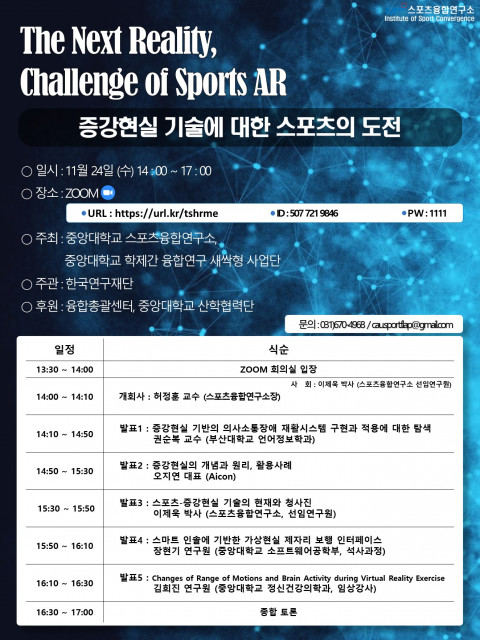 지난 11월 23일(화), 융합연구총괄센터는 24일 온라인 ZOOM을 통해 ‘증강현실 기술에 대한 스포츠의 도전’ 세미나가 개최된다고 밝혔다. 이번 세미나는 한국연구재단과 융합연구총괄센터의 지원을 받는 포스트 혼존성 사회의 문화갈등 극복을 위한 가상현실(VR) 콘텐츠 개발 연구팀과 중앙대학교 스포츠융합연구소가 진행한다.