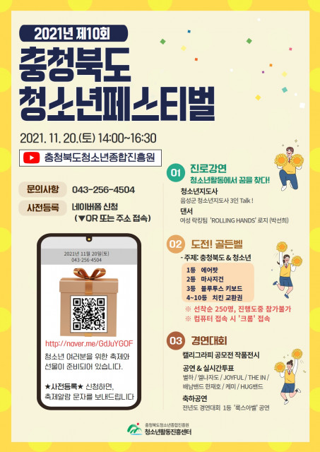 충청북도청소년종합진흥원(원장 신찬인) 청소년활동진흥센터는 11월 20일(토) 오후 2시에 제10회 충청북도청소년페스티벌을 온라인으로 개최한다고 밝혔다. 올해로 제10회를 맞이한 충청북도청소년페스티벌은 도내 청소년 7명으로 구성된 청소년기획단이 축제 기획, 홍보, 운영에 모두 참여하여 다채로운 프로그램을 준비했다.