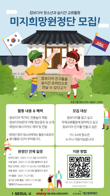 서울시립청소년문화교류센터(이하 미지센터)는 비대면 해외 청소년 교류 활동 '미지희망원정단'을 모집한다. 미지희망원정단은 코로나19 사태의 장기화로 인해 해외 교류 및 봉사가 어려운 시기에 해외 청소년과의 온라인 국제 교류 프로그램을 제공함으로써 문화 체험 및 자원봉사 기회를 지원하고자 실시한다.