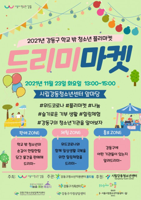 지난 11월 17일(수), 서울시 강동구(구청장 이정훈)가 지원하는 강동구청소년지원센터 꿈드림(센터장 최은영)이 다가오는 11월 23일(화)부터 오후 1시~3시 동안 학교 밖 청소년 플리마켓 드리미마켓을 운영한다고 밝혔다.