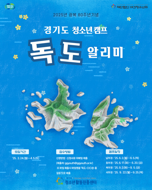 경기도는 광복 80주년을 맞아 독도에 대한 올바른 역사 인식 확립 및 영토 주권 의식 제고를 위해 '독도 알리미' 청소년 캠프 참가자를 모집한다고 밝혔다. 이번 '독도 알리미' 청소년 캠프는 독도와 울릉도를 직접 방문해 역사 및 문화, 환경에 대해 탐사하고 독도 수호 퍼포먼스를 진행함으로써 독도를 알리는 프로그램이다.