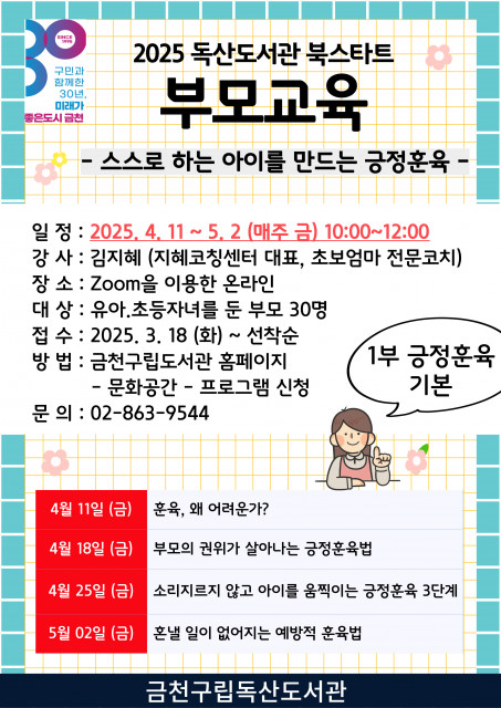 금천문화재단(대표이사 서영철) 금천구립독산도서관은 오는 4월 11일(금)부터 영유아 및 초등 자녀 부모를 위한 '2025년 금천구 북스타트 사업'을 운영하다고 전했다. 이번 사업은 금천구립독산도서관에서 마련했으며 '북스타트'는 지난 1992년 영국에서 시작한 독서 문화 확산 운동이자 우리나라에서는 '책과 함께 인생을 시작하자'라는 취지를 기반으로 지방자치단체 및 북스타트코리아가 함께 진행하는 지역 사회 문화 운동이다.