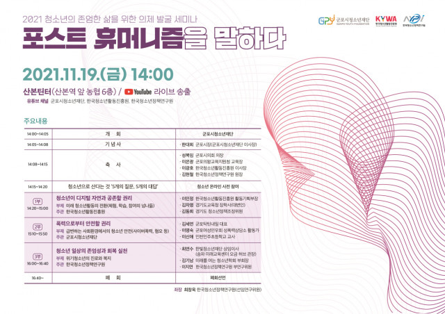 11월 19일(금), 군포시청소년재단(이사장 한 대희 군포시장)은 국무총리 산하 국책연구기관 한국청소년정책연구원, 여성가족부 산하 준정부기관 한국청소년활동진흥원과 함께 ‘청소년의 존엄한 삶을 위한 의제 발굴 세미나 - 포스트 휴머니즘을 말하다’를 개최한다.