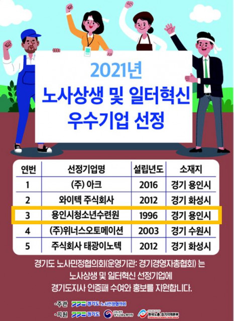용인시청소년수련원, '2021년도 노사 상생 및 일터 혁신' 우수기업 선정