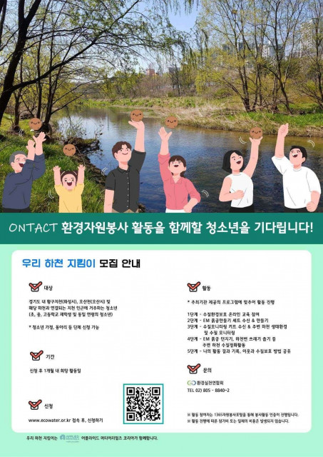 환경실천연합회(이하 환실련, 회장 이경율)가 경기지역의 청소년들을 대상으로 비대면 수질 보호 활동인 '우리 하천 지킴이' 참여자를 모집한다. 본 활동은 경기도 대표 하천인 황구지천(경기 화성)과 오산천(경기 오산) 및 그 인근 지천의 수질을 개선하기 위해 하천 생태계 모니터링과 EM 흙공을 이용한 수질 정화를 진행하는 프로그램이다.