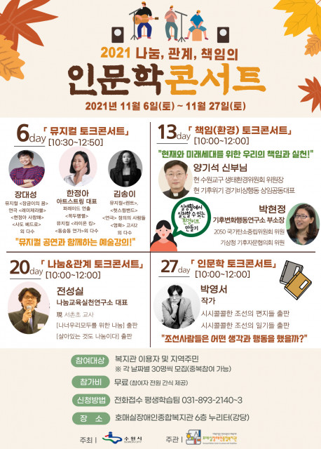 지난 11월 2일(화), 호매실장애인종합복지관은 11월 매주 토요일(6일, 13일, 20일, 27일) 2021년 인문학 콘서트 ‘나눔, 관계, 책임의 인문학’을 진행한다고 밝혔다. 이번 콘서트는 2021년 수원시 '인문학 콘서트' 공모사업 선정에 따라 인문학을 통한 장애인과 비장애인의 정서적 안정 도모 및 삶의 만족감 향상을 위해 개최되었다.