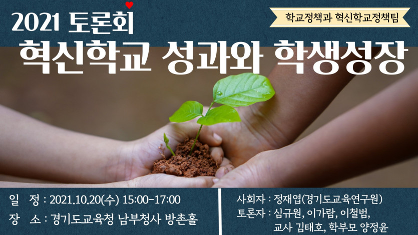 경기도교육청(교육감 이재정)이 20일(수) 혁신학교 졸업생과 학부모, 교사가 함께 ‘2021 혁신학교 성과와 학생성장’을 공유하고 토론하는 자리를 마련한다. 도교육청은 2009년 시작 이래 올해로 13년 차에 접어든 혁신학교 성과를 교육 관점에서 여러 각도로 평가·분석하고, 혁신학교 졸업 학생들이 직접 의견을 공유할 수 있도록 이번 토론회를 계획했다.