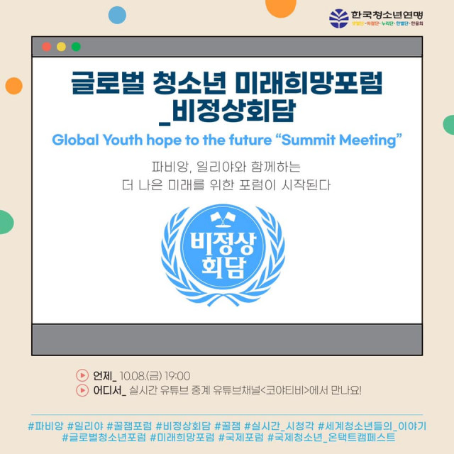 10월 7일(목), 한국청소년연맹(총재 임호영)은 ‘2021 국제청소년온택트캠페스트’ 국제 교류 활동의 하나로 다가오는 10월 8일(금)에 온라인상으로 ‘글로벌 청소년 미래희망 포럼 비정상회담’을 개최한다고 밝혔다. 이번 포럼은 인기 방송인 비정상회담에서 아이디어를 얻어 ‘더 좋은 세상을 만들기 위해서 우리가 할 수 있는 일은 무엇일까’라는 주제를 바탕으로 10월 8일(금) 오후 7시부터 한국청소년연맹 유튜브(코야티비)로 생중계된다.