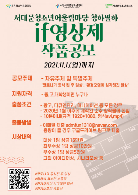 서대문청소년센터는 지난 10월 1일(금)부터 다가오는 11월 1일(월)까지 ‘iF영상제’에 상영될 영상 작품을 모집한다고 밝혔다. 이번 ‘iF영상제’는 ‘만약에 …이라면?’의 특별 주제와 자유주제를 바탕으로 코로나19를 극복하기 위한 의지 고취와 일상의 소중함 및 환경 보호의 경각심을 고취시키는 영상을 모집한다. 영상 장르는 뉴스, 다큐멘터리, 뮤직비디오, CF, 단편영화, 드라마, 애니메이션 등 모두 가능하며 중·고·대학생 청소년이면 누구나 개인 또는 팀으로 참가가 가능하다.