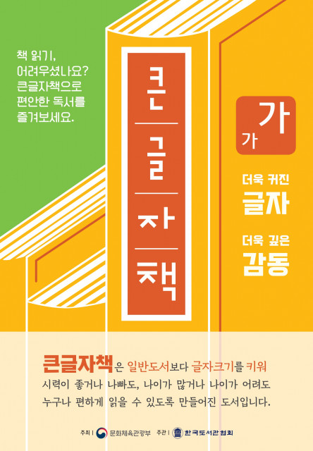 한국도서관협회(회장 남영준)는 문화체육관광부(장관 황희)와 함께 중장년층의 독서 생활을 지원하고자 2021년 큰글자책 24종 1만 6800권을 제작해 전국 공공도서관 700곳에 보급했다고 밝혔다. 이를 통해 ‘나는 나로 살기로 했다’, ‘나는 말하듯이 쓴다’ 등 최신성을 유지한 신간 자료 뿐만 아니라 폭넓은 주제의 다양한 도서를 큰글자책으로 만나 볼 수 있다. 글자 크기는 16포인트로 모두 동일하게 제작했으며, 책 크기도 균일하게 제작함으로써 도서관 서가에서도 한눈에 들어올 수 있도록 했다.