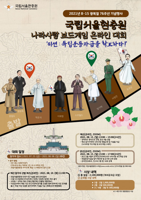 초등학교 고학년 학생들을 대상으로 '나라사랑 보드게임 온라인 대회'가 개최된다. 국립서울현충원과 현충원 주요 안장자에 대한 관심과 함께 나라사랑 정신을 높이고자 기획된 이번 대회를 위해 국립서울현충원은 현충원에 안장한 주요 독립운동가들의 활동을 주제로 나라사랑 보드게임과 카드게임 등을 개발했다.