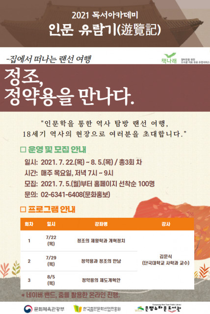 구립은평뉴타운도서관(관장 박종범)은 7월 22일(목)부터 8월 5일(목)까지 단국대학교 김문식 교수를 초청해 독서 아카데미 ‘정조, 정약용을 만나다’를 진행한다고 밝혔다. 독서 아카데미는 문화체육관광부가 주최하고 한국출판문화산업진흥원이 주관하는 사업으로 인문학 강좌를 통해 전 국민 독서문화를 확산하고자 시작되었다.