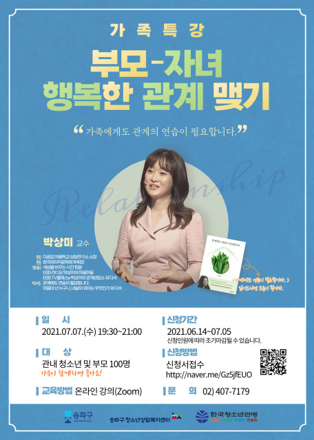송파구청소년상담복지센터, 7월 7일(수) ‘부모-자녀 행복한 관계 맺기’ 가족특강 개최