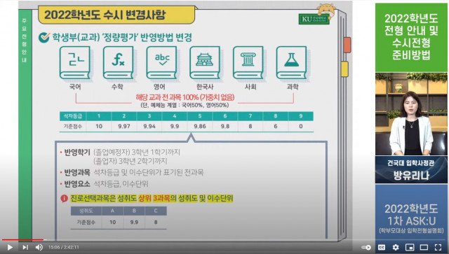 건국대 입학처(처장 이태형)가 최근 비대면 실시간 중계 방식으로 진행한 입학 전형 설명회 ‘ASK:U’ 영상을 공개했다. 지난 22일(화) 건국대는 수험생과 학부모에게 2022학년도 건국대 입시 정보를 제공하기 위해 약 2시간 40분 동안 실시간 라이브로 입학 전형 설명회 ‘ASK:U’ 1차를 진행했다.